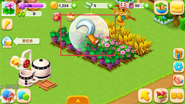 2、进入场景后,点击被框选的工具(镰刀),完成对应操作以获取制作牛奶的原料,推进任务进度。