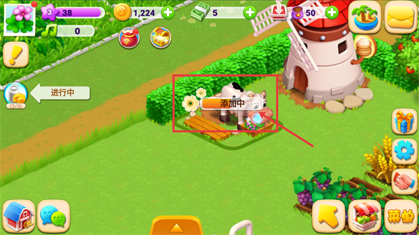 3、在奶牛区域,等待“添加中”流程完成,获取制作牛奶所需的基础材料,持续推进任务的原料准备环节。