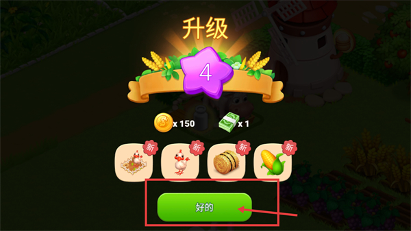 4、升级界面中,点击被框选的【好的】按钮,确认升级奖励(金币150等),继续推进任务解锁新内容。