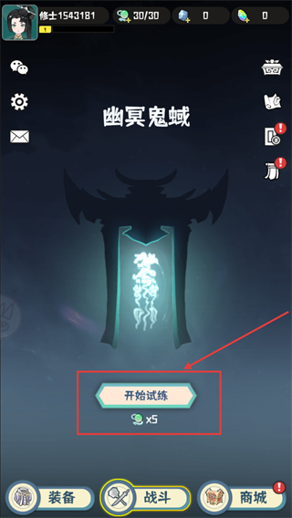 1、进入幽冥鬼蜮界面点击开始试炼消耗【绿玉-5】开启修仙roguelike的幽冥挑战之旅。