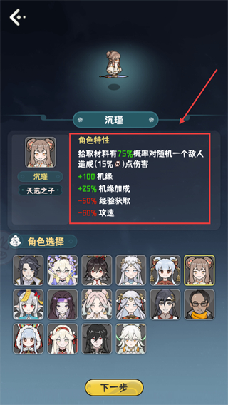 2、选择角色【沉瑾】时需权衡,其拾取材料触发伤害加机缘减经验攻速的特性搭配玩法。