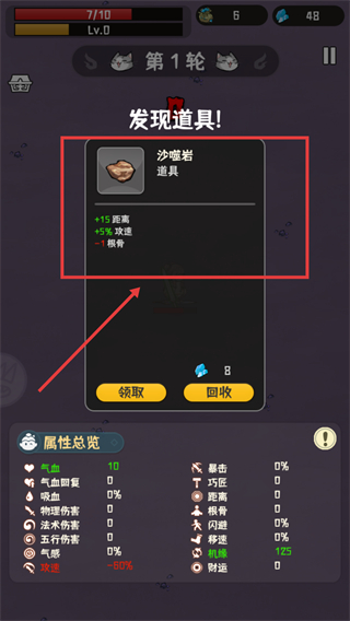 4、拾取【沙噬岩】道具可加距离攻速,但减根骨需根据当前属性战斗需求选领取或回收。