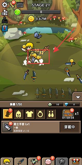 3、【STAGE21】战斗获取金币后,购买勇士手套等装备,提升角色属性增强【BladeCrafter2】战斗能力。