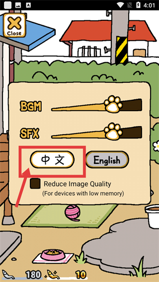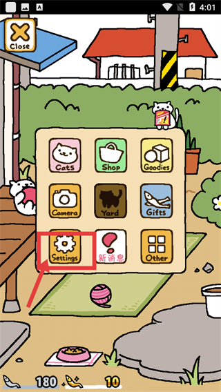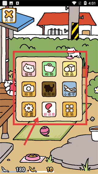 4、语言切换完成后,功能界面显示为中文标识(如猫咪、商店等),操作更便捷,可继续推进庭院的互动流程。