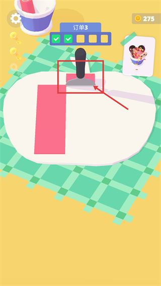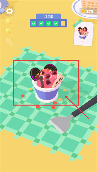 3、将材料装入被框选的容器中,完成订单3的制作流程,容器会呈现成品效果,订单进度条填满对勾。