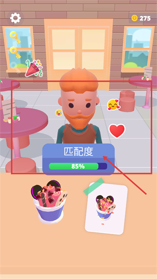 4、成品交付后,顾客界面显示【匹配度85%】,代表订单完成质量达标,可获取对应奖励并推进后续订单。