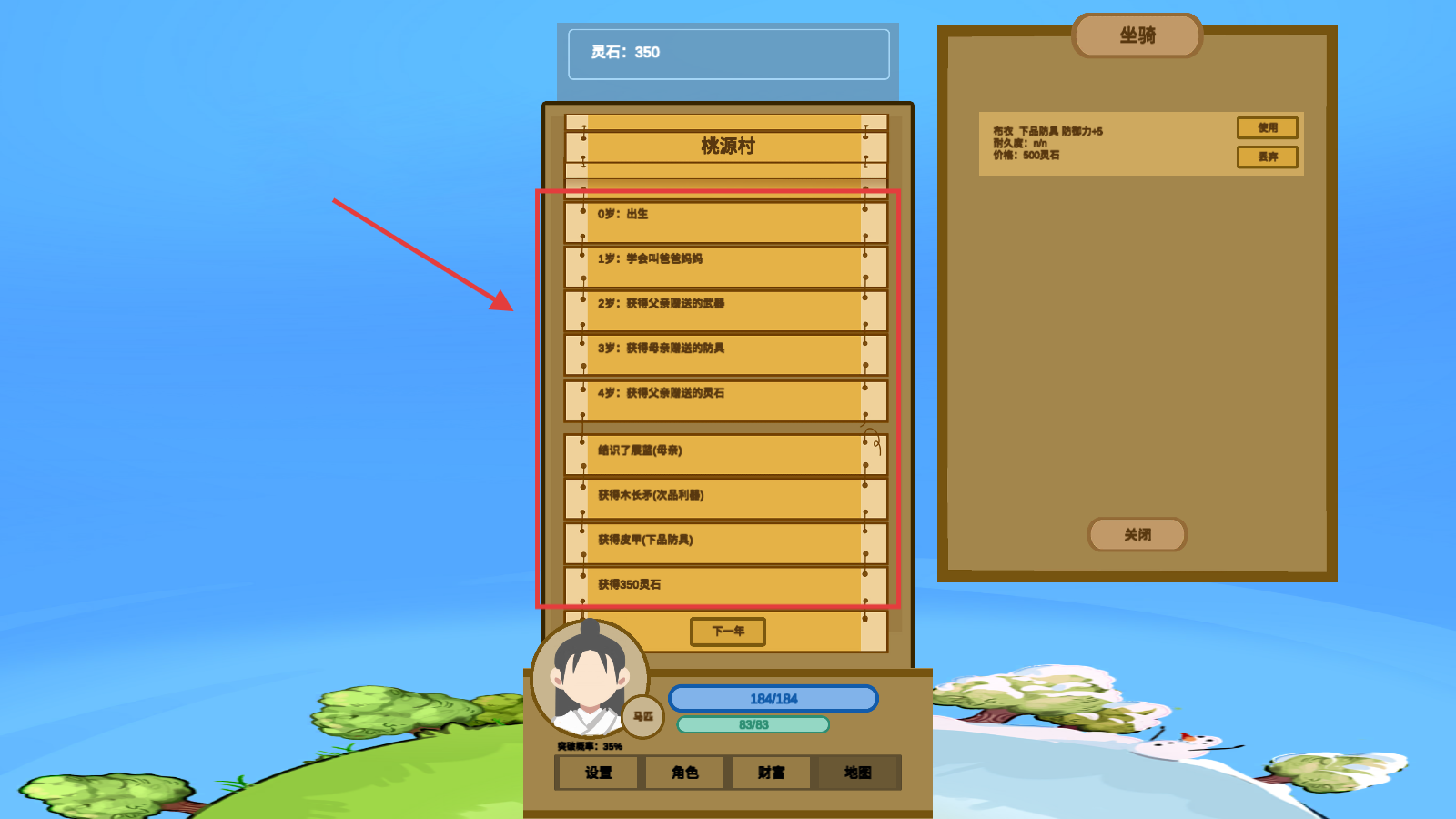 2、在桃源村界面点击【下一年】按钮,解锁成长事件积累灵石与道具提升初始资源储备。