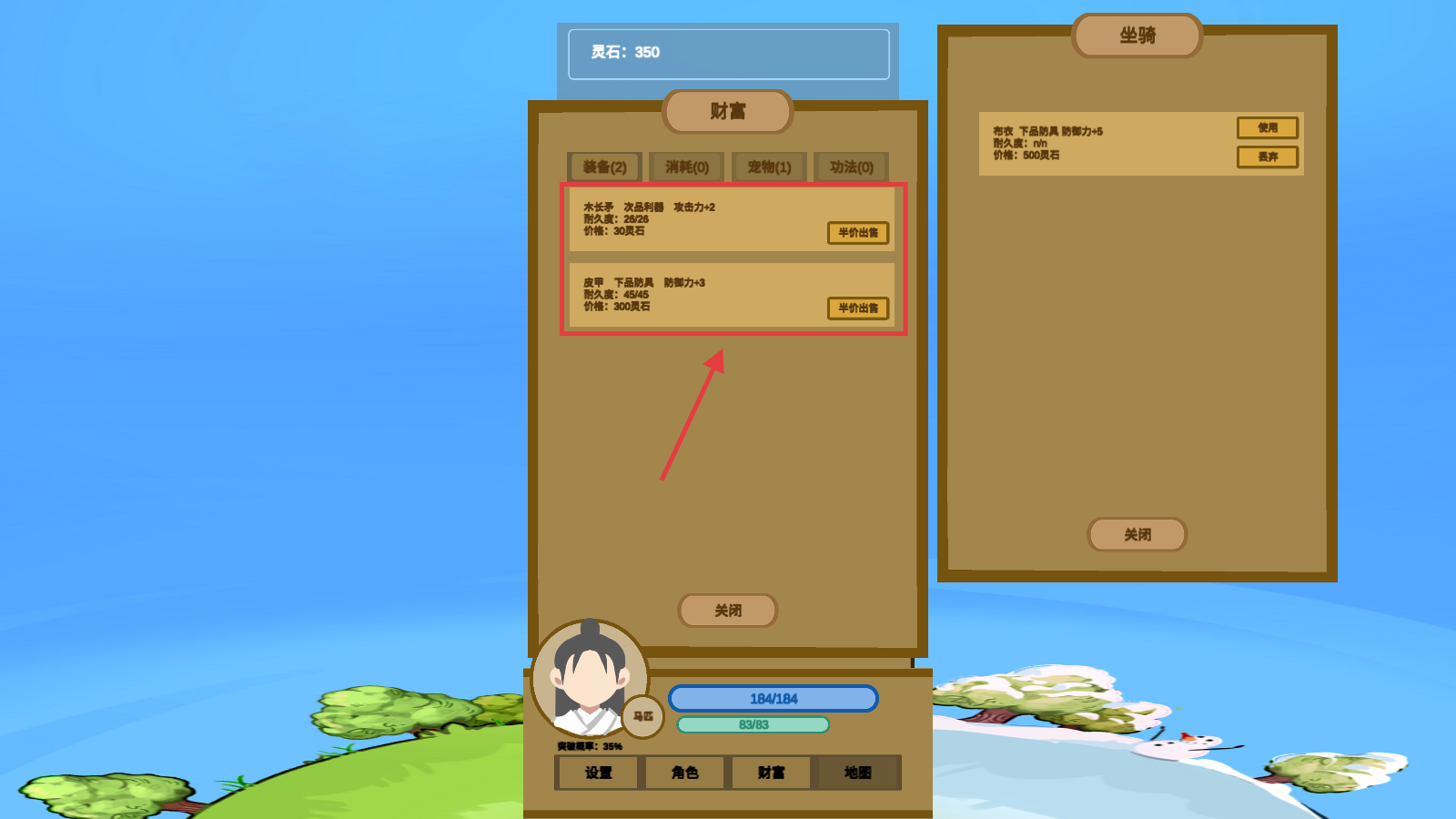 3、进入【财富】界面装备栏,半价出售【木长矛】-【皮甲】获取灵石用于后续修炼或购物。