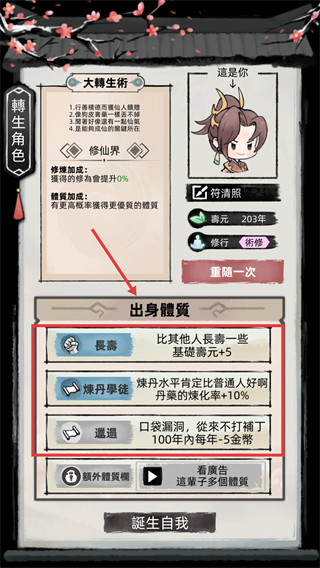 2、创建角色时优先选择【长寿】体质,基础寿元+5能延长修炼时间,为后续突破境界提供更多机会。