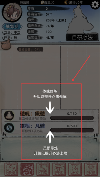 4、进入修炼界面后优先升级【体魄修炼】提升点击修为获取速度,再升级【灵根修炼】增加心法上限。