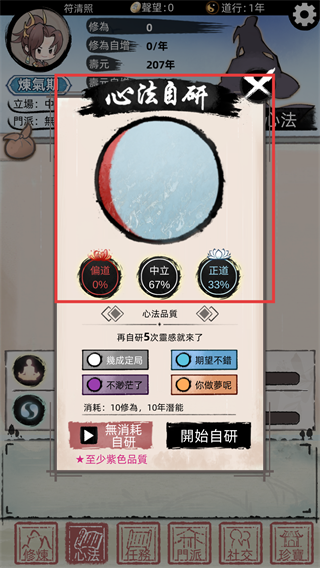 3、消耗寿元与修为自研心法,结合立场占比与境界品质,定制专属修炼助力。