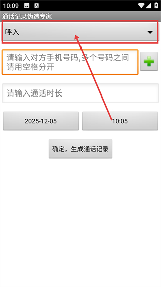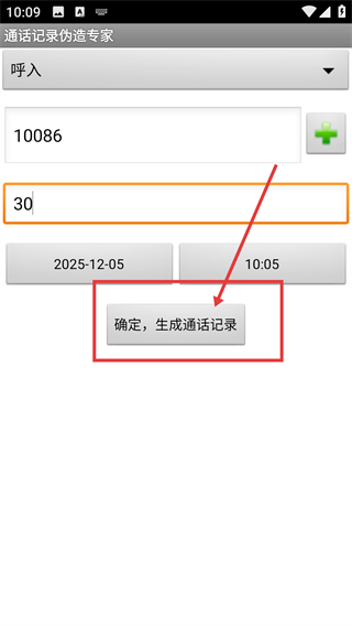 3、设置好日期【2025-12-05】和时间【10:05】,点击底部【确定-生成通话记录】按钮呀。