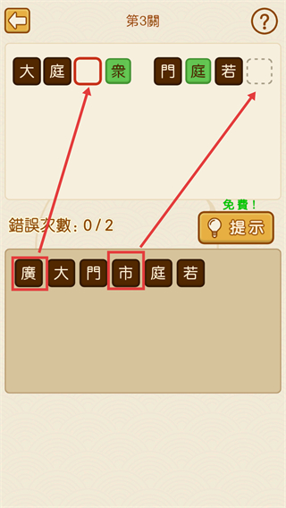 2、此为第3关成语填空关卡,需用【廣】【市】填入对应空位,补全【大庭廣眾】【門庭若市】。