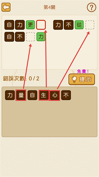 3、进入第4关成语填空关卡,将【量】【生】【心】填入对应位置,补全【自力更生】【力不從心】【自不量力】,可借助提示辅助完成。