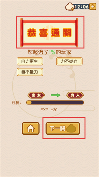 4、通关后出现【恭喜通關】提示,点击【下一關】继续挑战。