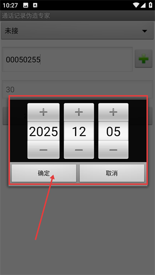 3、点击时间旁边的按钮会弹出日期选择器,用加减号调整到【2025-12-05】,然后点【确定】完成设置呀。