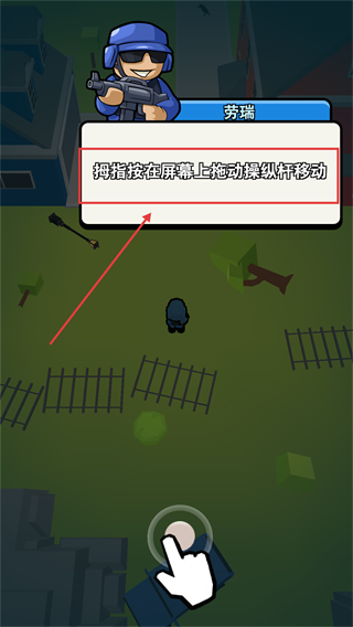 1、操控【劳瑞】时,拇指按屏幕拖动摇杆移动角色,灵活调整位置应对僵尸威胁。