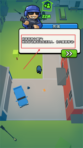 2、【劳瑞】会自动射击僵尸,无需手动开火,专注拖动摇杆移动避开攻击即可。