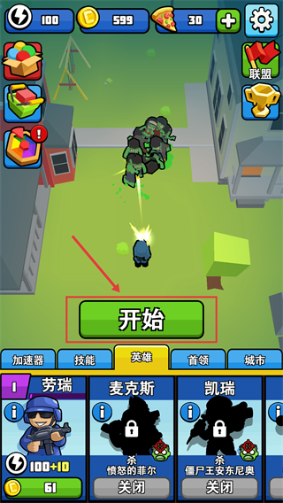 2、点击界面中的【开始】按钮进入战斗,面对僵尸群时利用免费武器射击,快速消灭敌人积累生存资源。