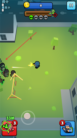 4、战斗时控制角色灵活移动避开僵尸包围,同时使用【技能】清理密集敌人,利用免费道具补充物资保持存活。