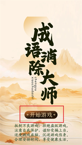 1、界面展示【成语消除大师】,点击【开始游戏】按钮进入闯关流程,开启成语消除的游玩环节。