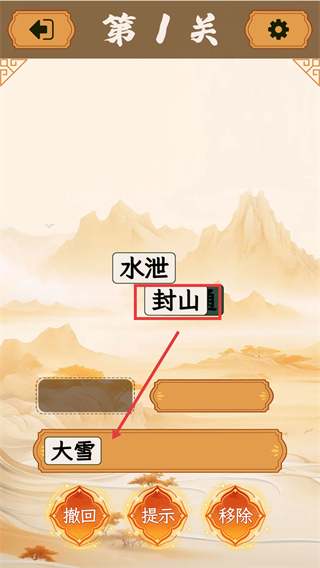 2、第1关中,将【封山】匹配【大雪】组成【大雪封山】,结合【水泄】补全对应成语,可使用功能辅助完成答题。