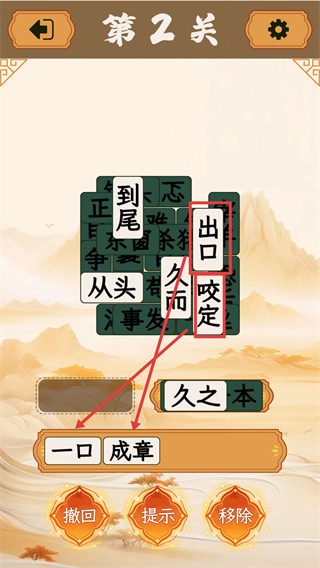 3、第2关需利用【出口】【咬定】对应【一口】【成章】组成【出口成章】【一口咬定】,完成游戏。