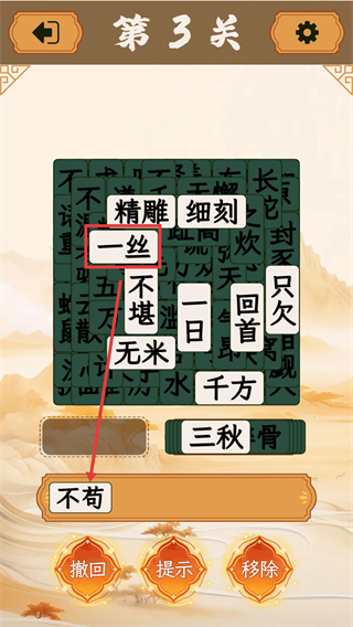4、第3关将【一丝】与【不苟】组合成【一丝不苟】,同时结合【精雕细刻】【一日三秋】等成语,借助【提示】功能完成本关答题。
