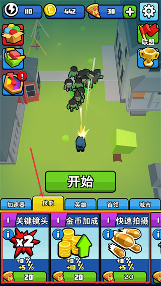 4、挑战尸王前,用无限金币升级主力角色属性,搭配合适辅助,借助攻速加成轻松应对强力敌人。