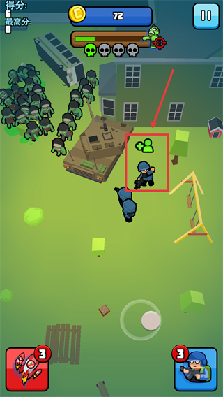 3、遇到幸存者图标时及时靠近获取增援,增加团队人数可提升火力应对更多僵尸威胁。