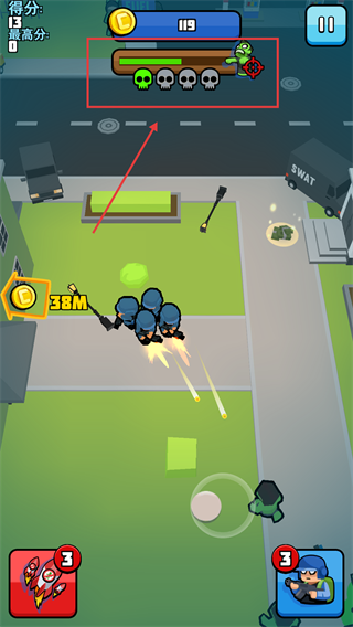4、持续消灭僵尸推进上方进度条,完成关卡目标可解锁新区域获取更多奖励提升实力。