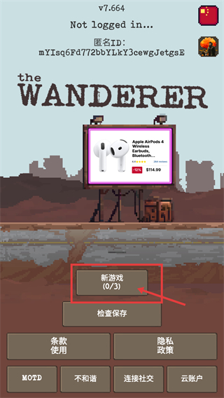 1、在【the-WANDERER】界面,点击被框选的【新游戏(0/3)】按钮,开启游戏进程,进入角色创建环节。