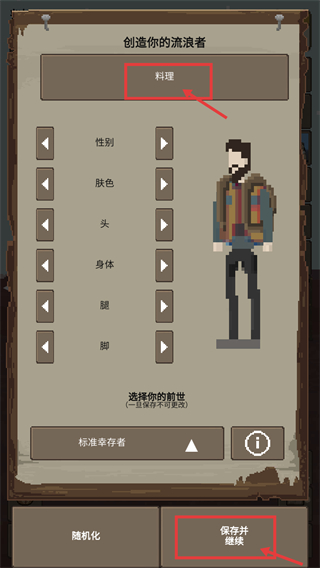 2、角色创建界面选择调整外观后点击被框选的【保存并继续】按钮,确定角色信息进入游戏。