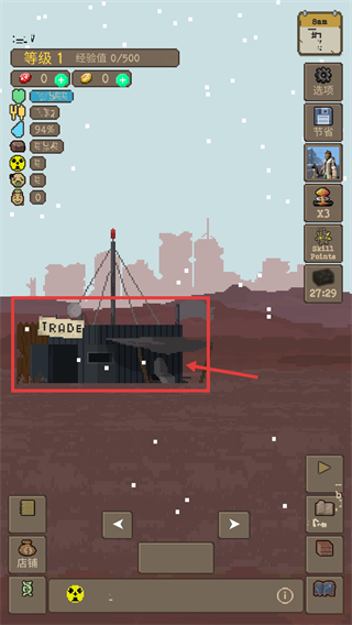 3、游戏场景中,点击被框选的【TRADE】建筑,进入交易界面,可与商人进行物资的买卖交互。