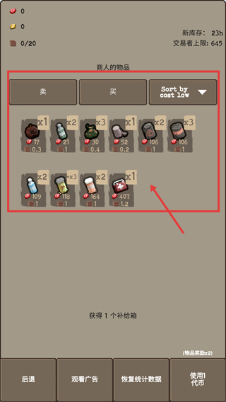 4、交易界面里,查看被框选的商人物品列表,按需选择“买/卖”操作获取物资,同时可获得补给箱奖励。