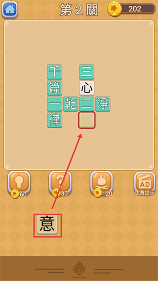 1、第2关中,将【意】填入对应空位,可组成【三心二意】,结合已有【千篇一律】完成成语匹配。。