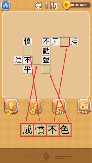 3、第4关中,用【成】【憤】【不】【色】填入空位,补全【愤愤不平】【泣不成声】等成语,可借助【提示】功能推进关卡进度。