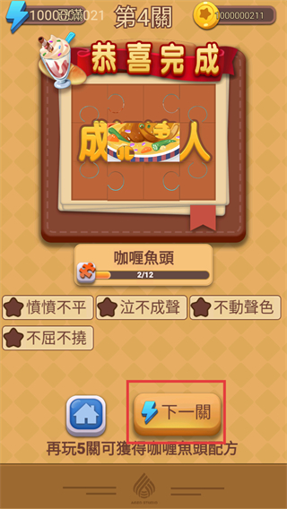 4、通关后显示【恭喜完成】,点击【下一關】继续挑战。