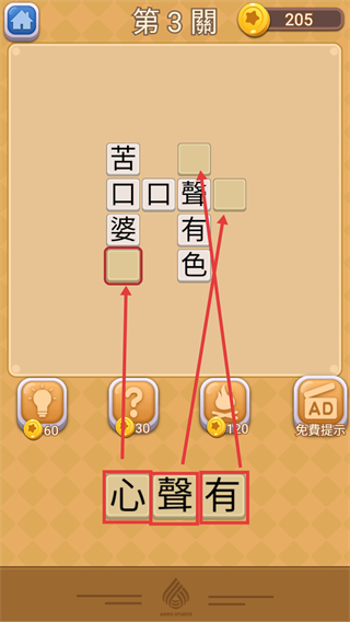 2、第3关需把【心】【聲】【有】填入对应空位,补全【苦口婆心】【有声有色】等成语,利用下方文字与界面元素完成匹配。