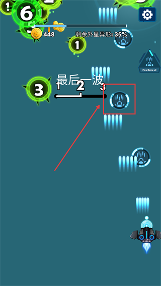 3、【最后一波】病毒来袭时,触发【射速加成】道具提升输出,快速清理剩余的【外星异形】。
