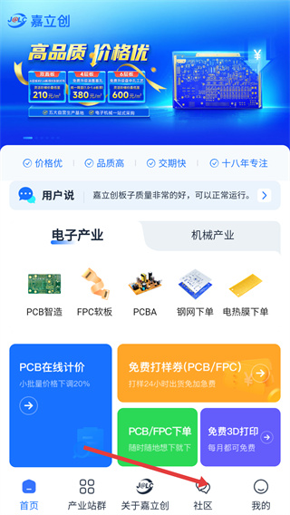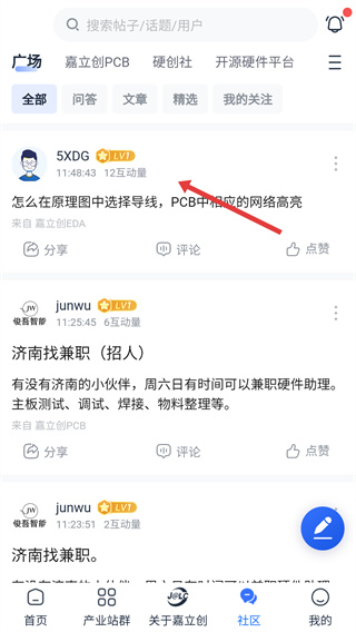1、在嘉立创首页点击底部【社区】选项,进入社区页面,可浏览电子产业相关的各类帖子内容。