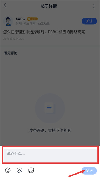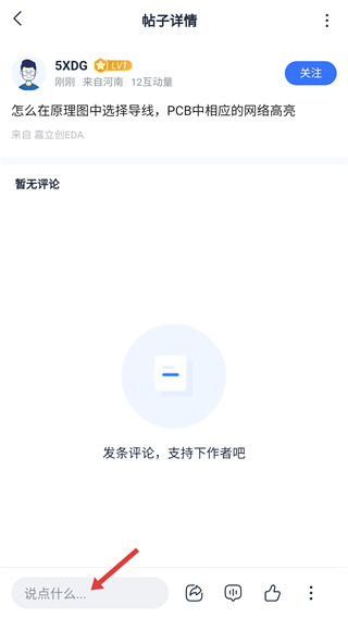 3、在帖子详情页点击底部【说点什么...】输入框,激活输入区域,准备填写评论内容。