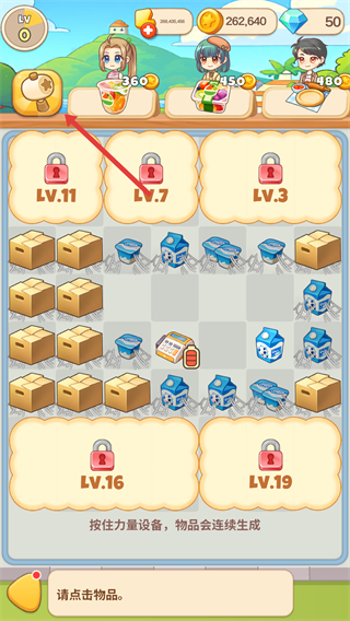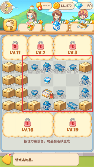1、在关卡界面点击红框内的物品,按住设备可让物品连续生成,积累相同物品以便合成。
