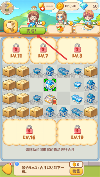 2、完成合成后,将合成好的物品拖动至【完成】即可获得金币。