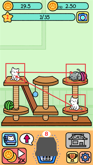 1、在主界面点击底部标有数字的【箱子】,将其放置到猫爬架区域,触发猫咪生成,同时开始获取猫爪币。