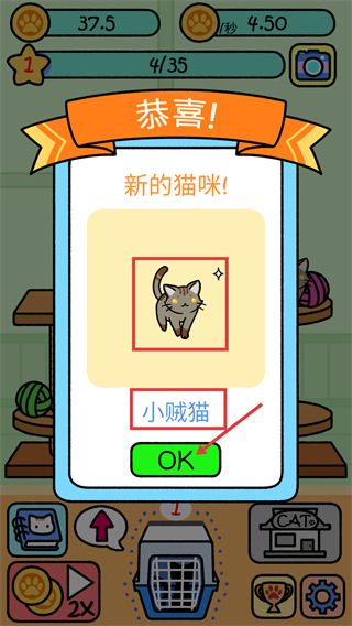 3、解锁新猫咪(如“小贼猫”)时,点击弹窗中的【OK】按钮完成确认,新猫咪会加入场景,助力后续收益增长或功能解锁。