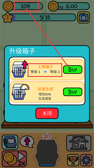 4、当猫爪币积累至足够数量,进入【升级箱子】界面,点击【Buy】按钮升级“上等箱子”,进一步提升猫爪币的获取效率。