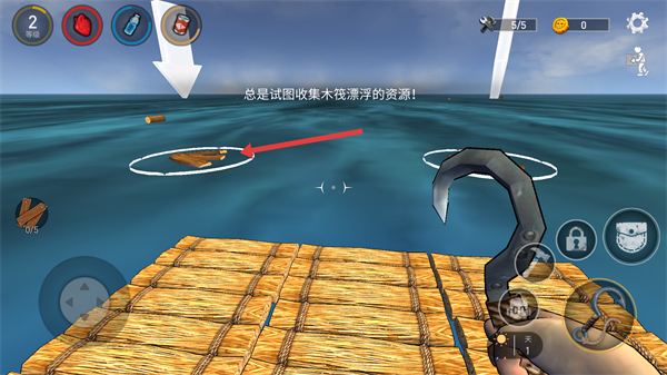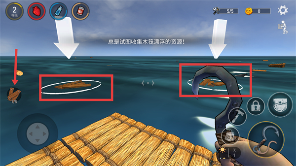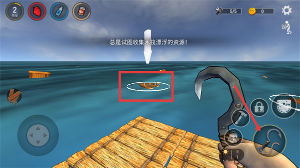 2、将【钩子】对准红框内的木板后,点击钩子按钮,勾取该资源以积累生存物资。