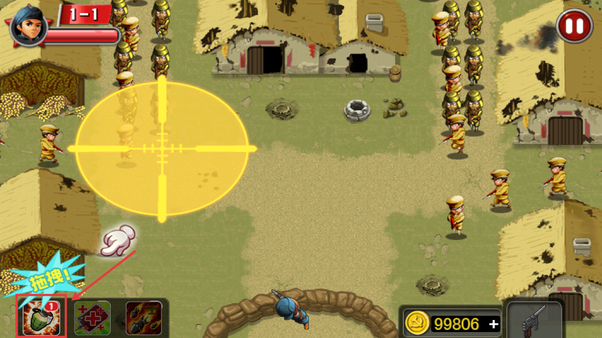 4、战斗中点击并【拖拽】左下角手雷图标,锁定鬼子密集区后松手引爆,造成大范围杀伤。