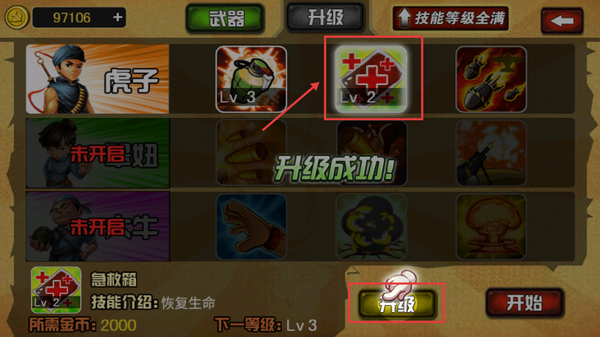 1、进入技能界面,用金币升级【急救箱】技能,提升回血效果,助力后续战斗更轻松。
